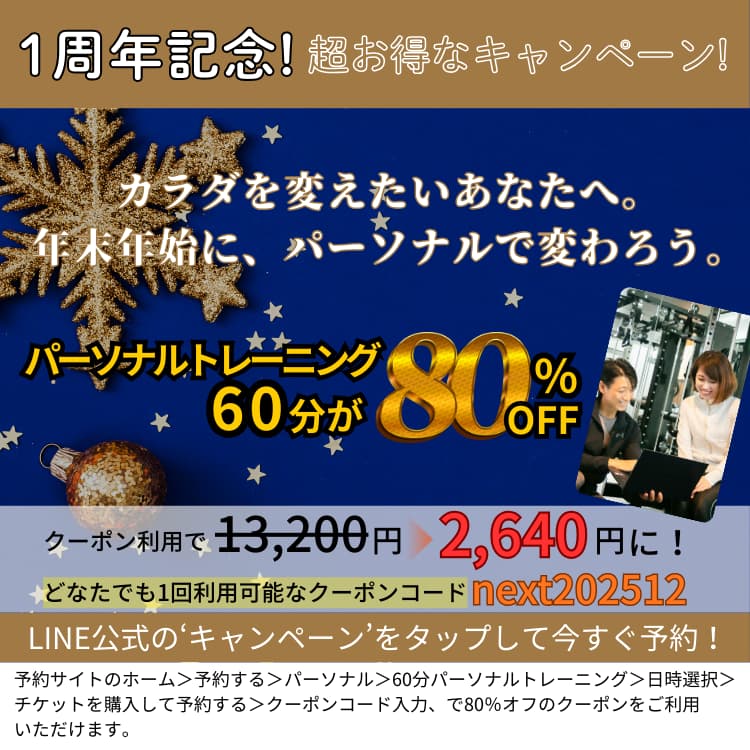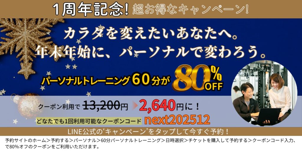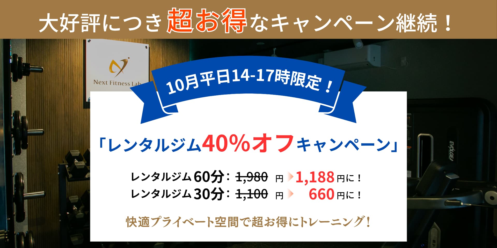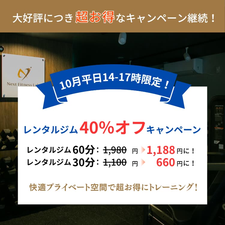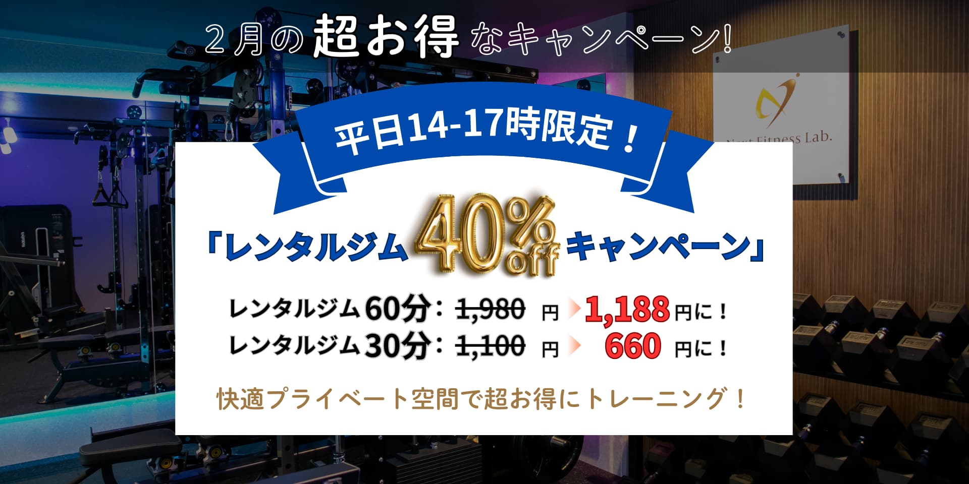 お得なキャンペーン実施中! 津田沼の新感覚トレーニングジム! . LINE公式から予約 LINE限定キャンペーン情報も配信! 予約サイトから直接予約 メディア掲載実績 Tarzan894号(マガジンハウス)に掲載されました! 書籍出版実績 先端テクノロジーを取り入れた 次世代型トレーニングジム スマートテクノロジーをジムに応用! パーソナライズされたトレーニング環境を24時間365日いつでも利用できる安心・安全・快適な空間 自分に合った運動メニューが分からない 他人の目が気になる、集中できない 手頃な費用で継続したい Next Fitness Lab.™なら あなたの お悩みを解決 できます 自分の目的や体力に合った運動種目や強度が分からない ジムを使ってみたいけど 運動器具の使い方が分からない 毎週のパーソナルトレーニングは費用が高くて継続しづらい 月額制では元が取れるか不安 他人の目を気にせずにトレーニングしたい 器具や空間を自分の好きなように使いたい 一人で集中してトレーニングしたい 家族や仲間と一緒にトレーニングを楽しみたい Next Fitness Lab.™で 全く新しいフィットネスを 体験してください あなただけの専用プログラムでトレーニングできる オーダーメイド・セルフトレーニング (レンタルジム) スマートフィットネスガイド™であなたの目的や体力などに合った運動種目や強度を簡単操作で設計できます。 専属トレーナーがサポート パーソナルトレーニング 専属トレーナーがあなたの目標達成に向けて、よりパーソナライズされた運動メニューの設計や食事管理のサポート等、目標達成に向けて伴走いたします。 圧倒的な高揚感と没入感で集中できる! 自分だけの快適空間 「トレーニング開始!」の一声で、照明・空調・音楽を一括で操作、さらに好きな音楽と照明がシンクロする高揚感と没入感でトレーニングにも集中できます。 誰にも会わずに好きな時に好きなだけ 24時間365日いつでも利用できる 予約から入退室まで、スマートロックにより誰にも会わずに安心・安全にご利用いただけます。24時間営業なので、あなたの都合に合わせて、柔軟に利用できます。 気軽に始められてリーズナブルに続けられる 入会金も会費もなし! 使いたい時にネットで簡単予約。1回毎のチケット制なので、好きな時に好きなだけ利用出来るから、お財布にも安心!しかも1回のチケットで2人まで同時利用できるから、家族や仲間と利用すればさらにお得! 選ばれる理由はココ! トレーニングジム比較 ○=特に優れている、△=普通/有り、×=強みとしていない/無し LINE公式から予約 LINE限定キャンペーン情報も配信! 予約サイトから直接予約 Next Fitness Lab.™はあなた専用のトレーニング空間です 使い方は 自由自在 一人で好きな時に好きなだけトレーニングしたい! 出勤、通学前の早朝に 家事や仕事の空き時間に 深夜にもくもくと! 突然の仕事の電話も気兼ねなく そんなあなたには オーダーメイド・セルフトレーニング スマートフィットネスガイド™により、ご自身の目的や体力に合致した運動メニューを理解、実践いただくパターンです。やり方を理解したら、ご自身で実践できる・実践したい方に最適な利用方法です。目的に応じた運動種目や強度のみならず、量や頻度についても知ることができるため、利用頻度の目安も理解できます。24 時間利用できるため、生活リズムに合わせてご利用いただくことが可能です。なお、22:00-5:00 の時間帯は、特にお得にご利用いただけるため、フィットネスでの朝活・夜活を嗜好される方にお勧めです。 タブレットに入力するだけであなたにピッタリの目的別運動プログラムを設計できる スマートフィットネスガイド™ セルフだけだとちょっと不安、 プロのサポートも欲しい 初めてのジムだから最初だけはトレーナーと一緒に進めたい パーソナルトレーニングを受けたかったけど、高額だからあきらめていた 1人だとなかなか継続できない 安心して取り組める パーソナル×セルフのハイブリッド パーソナルトレーニングを月1~2 回程度利用して運動メニューの設計・実践・食事管理の支援を受けながら、並行して週 1~2回のオーダーメイド・セルフトレーニング(レンタルジム)を利用するパターンです。パーソナルトレーニングによる高いレベルでの運動メニューの個別化、運動実践のアドバイス、食事管理のサポート、運動継続を支援するコミュニケーションを受けながら、比較的リーズナブルにご継続いただける、お勧めのパターンです。 しっかりと高品質なパーソナル トレーニングを受けたい プロのトレーナーにしっかりサポートして欲しい 結婚式やイベントなど、目的の日までに目標を達成したい コンテストに挑戦してみたい 会費制や月額制だと通い切れない事が多かった 確実に結果を出したいあなたへ プロの専属トレーナーによるきめ細かなサポート パーソナルトレーニングを毎週ご利用いただくパターンです。トレーナーによる手厚い支援を受けたい方に最適なご利用方法です。